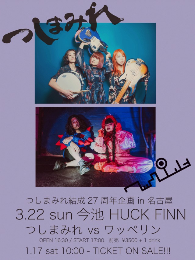3月22日(日) 今池 HUCK FINN つしまみれ vs ワッペリン 出演: つしまみれ, ワッペリン 時間: 16:30 / 17:00 チケット: 前売 ¥3500 + 1drink 当日 ¥4000 + 1drink 入場順: チケット→プレイガイド→予約